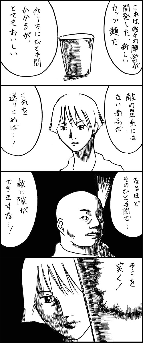<人物紹介> ■ノーマン大尉 スパイ部隊の若きリーダー。 敵陣営の撹乱を担当している。 好きなカップ麺はきつねうどん。 ■セキノ少尉 ノーマン大尉のブレーン。 年の功で難局を乗り越える。 好きなカップ麺は焼きそば