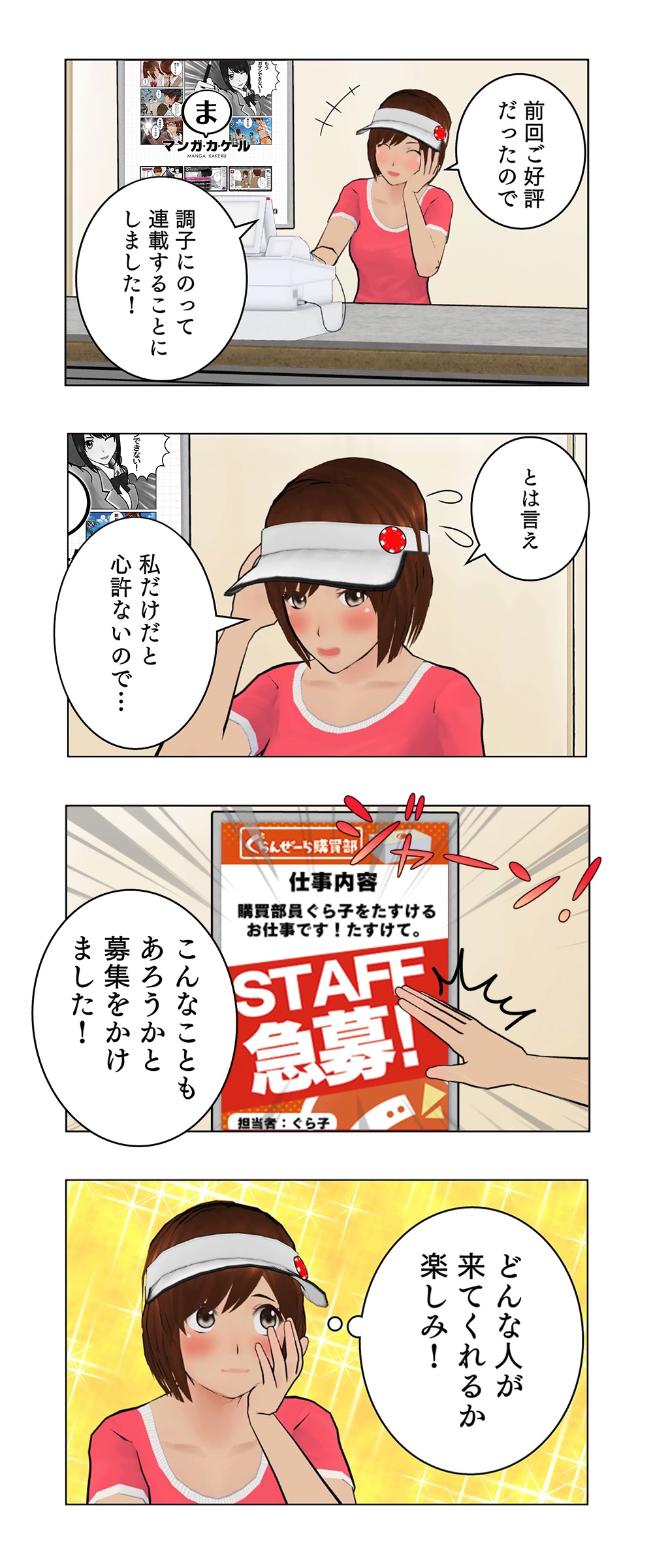ぐらんぜーら購買部のスタッフとして働いている。 購買部を盛り上げるため4コマ漫画に登場!
